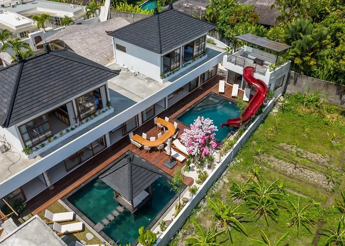 La villa 10Br Japanese Style, 2 Pools & Slide In Canggu Kerobokan cuenta con una piscina privada y se encuentra a 4 km de la Playa de Petitenget. Con una terraza, la villa está situada a unos 15 minutos en coche del Museo de Bali.